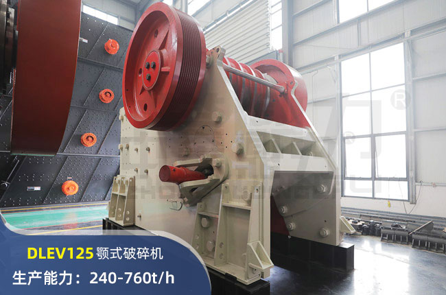 DLEV125鄂式破碎機每小時(shí)的產量為240-760噸,進料尺寸1250×950mm,排料口調整(zhěng)範圍75-275mm,電動機功率160kw,屬於產量適中的顎破機,一(yī)般(bān)適用於中小型碎石企業。