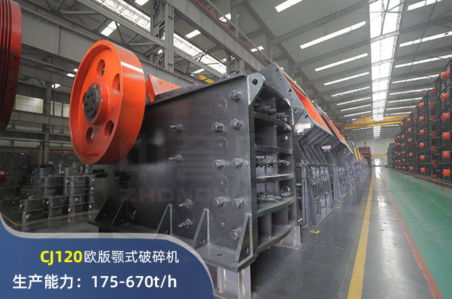CJ120歐(ōu)版顎式破碎機,進料口尺寸1200×870mm,進料粒度700mm,出料大小70-200mm,電機功率132kw,時產可達670噸。