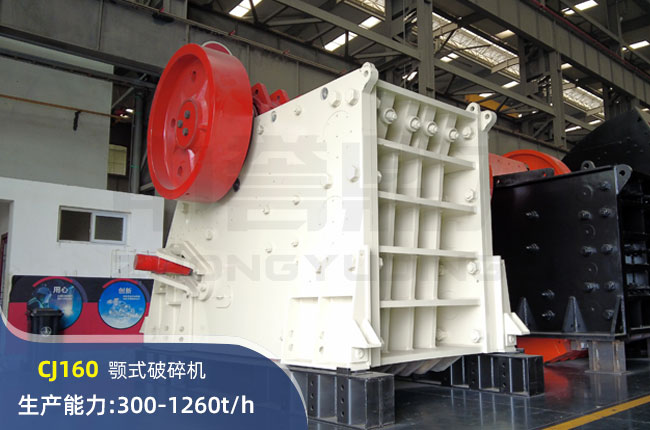 CJ160顎式破碎機進料口尺寸1600×1200mm,進料粒度960mm,出料大小150-300mm,電機功率250kw,時產可達1260噸(dūn)。