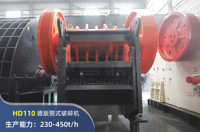HD110(912)顎式破碎機進料口尺(chǐ)寸850×1100mm,進料(liào)粒度750mm,出料大小100-200mm,電機功率6p 132kw,時產可達450噸。
