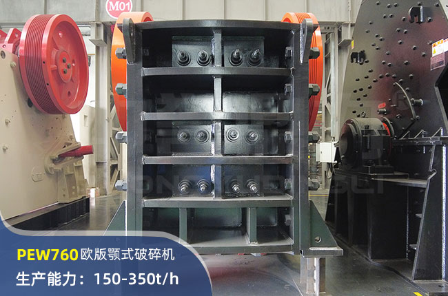 PEW760顎式破碎機進料口尺寸760×1100mm,進料粒度640mm,出(chū)料(liào)大小75-200mm,電機功率(lǜ)110kw,時產可達350噸左(zuǒ)右。