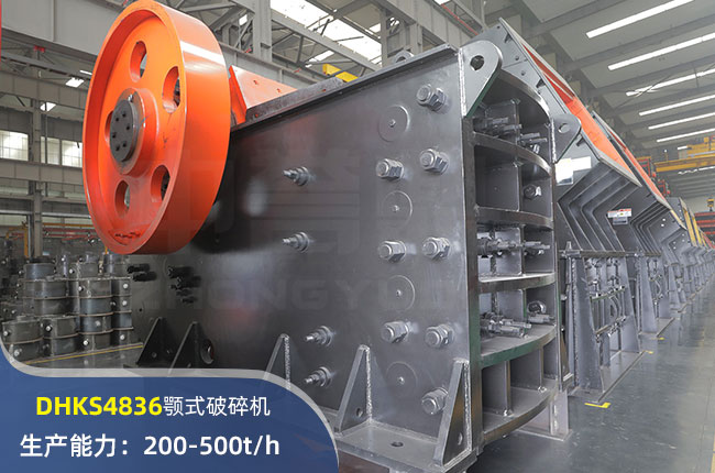 DHKS4836顎式破碎機進料口尺寸1220×910mm,進料粒度770mm,出料大小90-250mm,電機功率160kw,時產500噸左右。