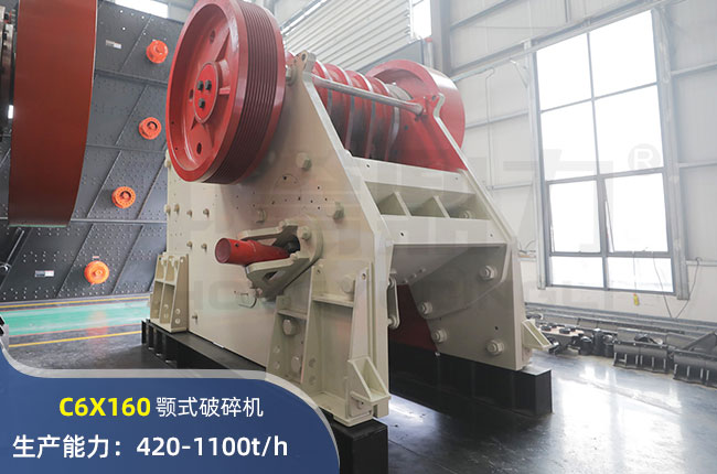 C6X160顎式破碎機型號(hào)C6X160,時產量420-1100噸(dūn),電機功率250千(qiān)瓦(wǎ),進料粒度1200mm,出料粒度150mm,是一台時產上千噸的(de)大型粗破設備。