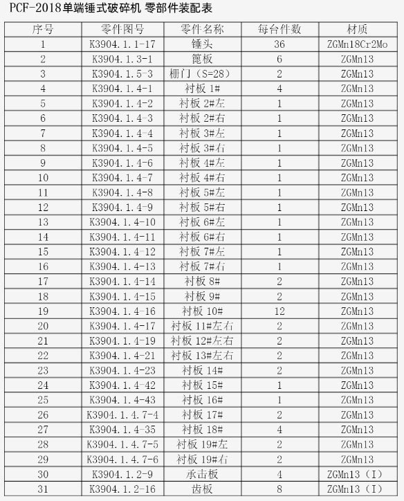 2018單段錘式破碎機(jī)有(yǒu)36個錘頭,采用ZGMn18Cr2Mo材質,即高錳鋼(gāng)錘(chuí)頭。
