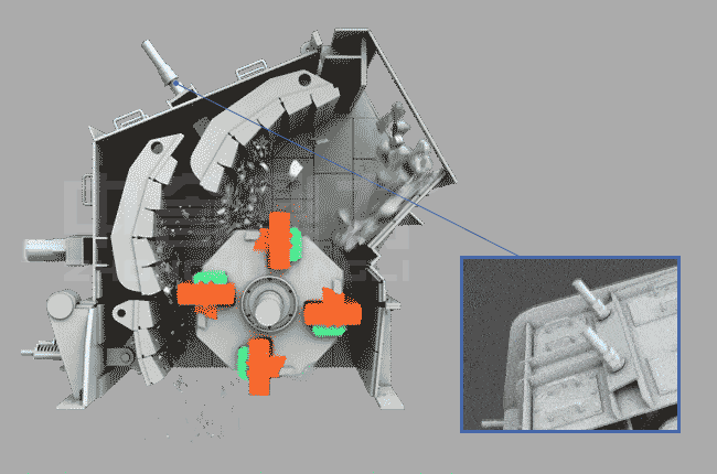 反(fǎn)击破碎机出料大小在15~40mm以下,可通过调整(zhěng)反击架和板锤间的距离,控制破碎粒度(dù)大小(即出料(liào)大小)。