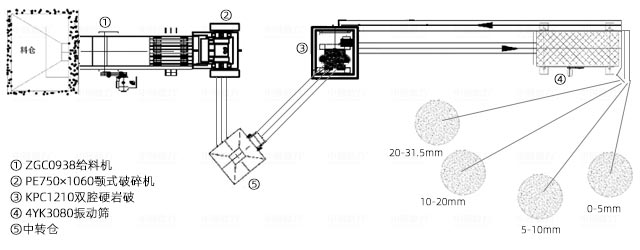 “鄂破+雙腔硬岩破”方案,成品花崗岩料粒(lì)型優於圓錐破,同傳統(tǒng)圓錐破配置相(xiàng)比,對於粒型要求較(jiào)高的,可節省(shěng)整形設備的投資。