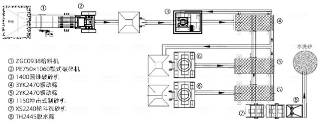 “鄂破+圓錐破+衝擊破”三段破碎方案,加上兩級篩分工藝,結合輪鬥洗砂機、脫水篩(shāi)設備對機製砂清洗作業,實現(xiàn)高品質機製砂生產。