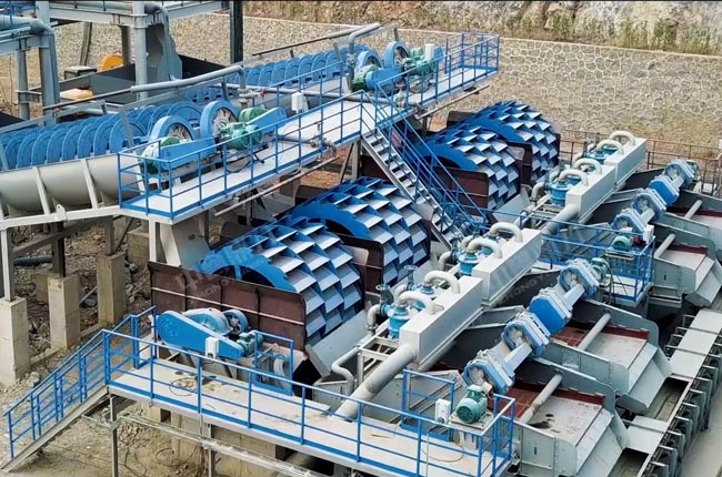 雙線並(bìng)行設計,原料(liào)經DLZGC2050給料(liào)機進DLPCZ1820重錘破,經DL2YKZ3680振動篩(預篩分樓)篩分,大於20mm的碎石料會進入DLPC1622整形破二(èr)次破碎整形,經DL4ZKS3680振動篩(成品篩分樓)篩出0-5mm、5-10mm、10-20mm、20-31.5mm四種成品料,0-5mm用於DLZXL300整形選(xuǎn)粉樓幹式選粉作業;其中20mm以下送至DLZSJ1618製砂機整形(xíng)製砂,然後經DL2YKZ3680振動篩(製砂篩分樓)篩分出0-5mm、5-10mm、10-20mm三種規格成品料,0-5mm普砂用於水洗(xǐ)原料,經DL2LXS1890雙螺旋洗砂機、DLXS3024輪鬥洗(xǐ)砂機、DLXSH2448洗沙回收(shōu)脫水一體機得出水洗砂。