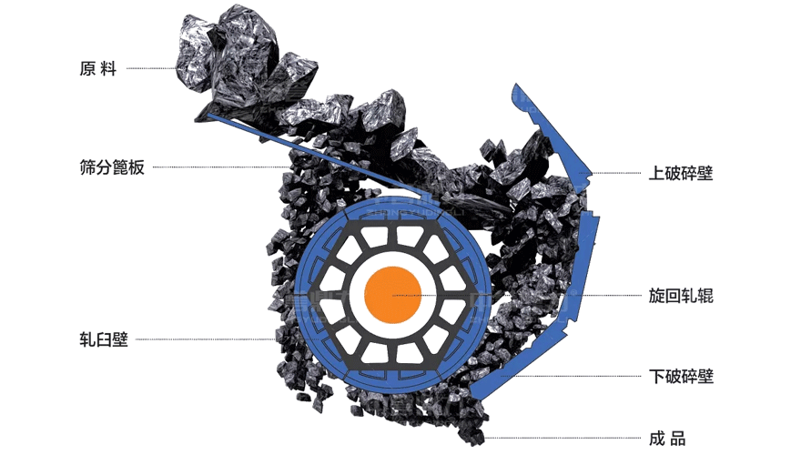 通過以下原理圖(tú),可(kě)以看出(chū),原料從進(jìn)料口進入機破碎腔,會(huì)先通過篩分篦板進行預分離處理,將小塊成品大小(xiǎo)碎(suì)石(shí)分離出去,其它石頭會進(jìn)入破碎腔,通過軋臼壁及(jí)破碎壁的擠壓,實(shí)現對石頭的破碎處理。臥式旋回破工作時旋回破碎輥會產生反向自(zì)轉,使軋臼壁磨損更加(jiā)均勻,避免因局部磨損更換整個部件的現象。另外排料口(kǒu)采用液壓調(diào)整,可以智能調整排料口大(dà)小。