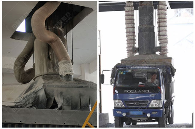 料倉自動放料裝車係統配(pèi)用了一種砂石料無(wú)塵(chén)裝車裝置,包括卸料鬥、升降控製裝、卸料筒(tǒng)體等,環保環節包括吸塵(chén)管(guǎn)、收塵(chén)器、伸縮套管等,吸料管設置在卸料筒體兩側,卸料口處有皮質吸塵(chén)罩抑塵,利於吸料管收集卸料揚塵。
